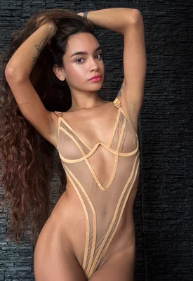 Dulce shines with exocit confidence while wearing a daring gold mesh bodysuit, teasing with every curve of her body. Throughout this Watch4Beauty gallery, this sexy babe strikes sultry poses in each shot, revealing more of her skin until she is eventually fully nude.